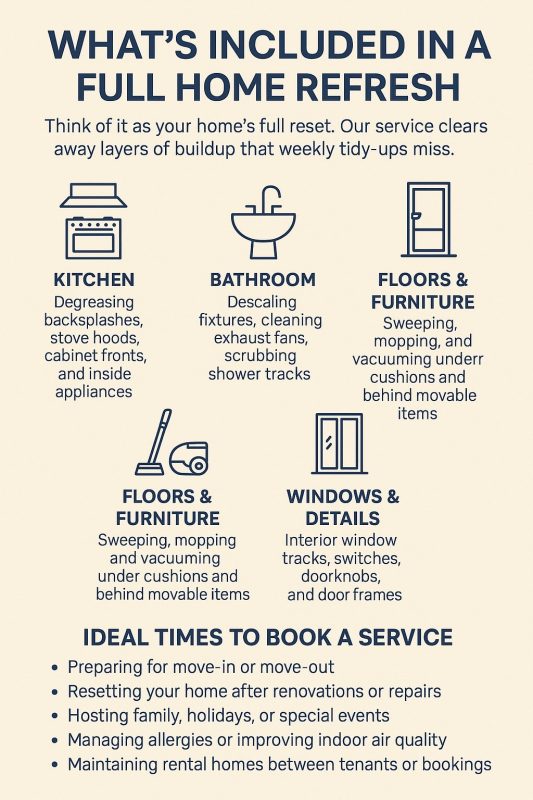 Think of it as your home’s full reset. Our service clears away layers of buildup that weekly tidy-ups miss: