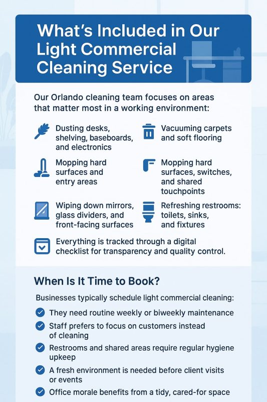 Running a business is demanding enough without having to think about overflowing bins or dusty floors. That’s where our light commercial cleaning Orlando service comes in. Whether you manage a cozy retail store, a busy medical suite, or a small office space near downtown, we keep things looking sharp and sanitary so your team and clients always feel welcome.